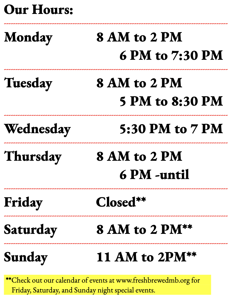 We are a faith-based, nonprofit community coffee house in the Arts & Innovation District of downtown Myrtle Beach. Our coffee house is a shared public space that has served the Grand Strand for 23 years, welcoming everyone in multifaceted areas.